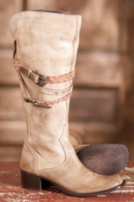 A cool fusion of western and rock ‘n’ roll, these Italian leather, knee-high boots boast a sandblasted texture and distressed finish
